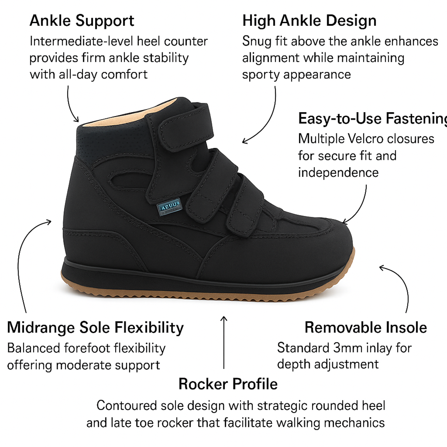 The AurelkaORTO 1009 Cub Orto combines professional-grade support with contemporary styling that young people genuinely want to wear. These expertly designed high-tops provide exceptional foot and ankle stability while looking like regular sports shoes. Parents appreciate the therapeutic benefits, healthcare professionals value the effective biomechanical support, and wearers simply enjoy having cool shoes that support their active lifestyle.